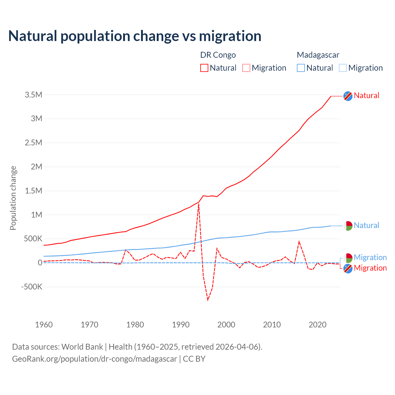 Over the last 10 years, 99.1% of the population change in the DR Congo is from natural causes (a gain of 30,150,516 people) and 0.89% is from migration (a gain of 270,872 people). In Madagascar 99.7% is from natural causes (a gain of 7,165,578 people) and 0.31% is from migration (a loss of 22,384 people).