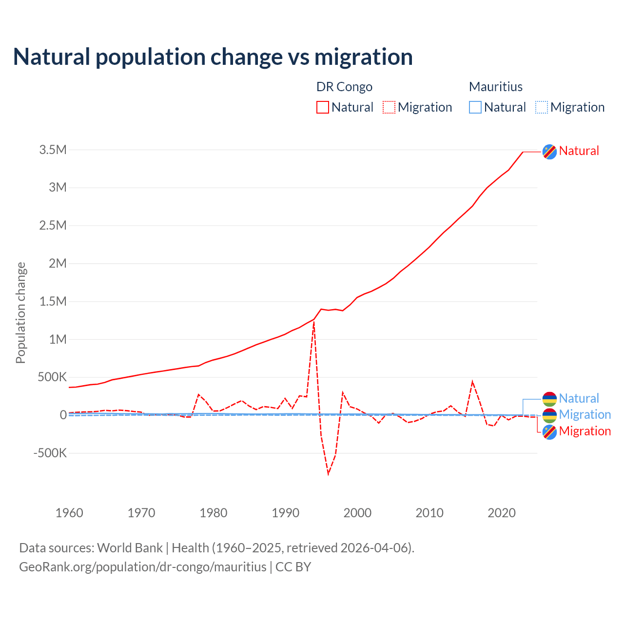 Over the last 10 years, 99.1% of the population change in the DR Congo is from natural causes (a gain of 30,150,516 people) and 0.89% is from migration (a gain of 270,872 people). In Mauritius 30.9% is from natural causes (a gain of 19,327 people) and 69.1% is from migration (a loss of 43,294 people).