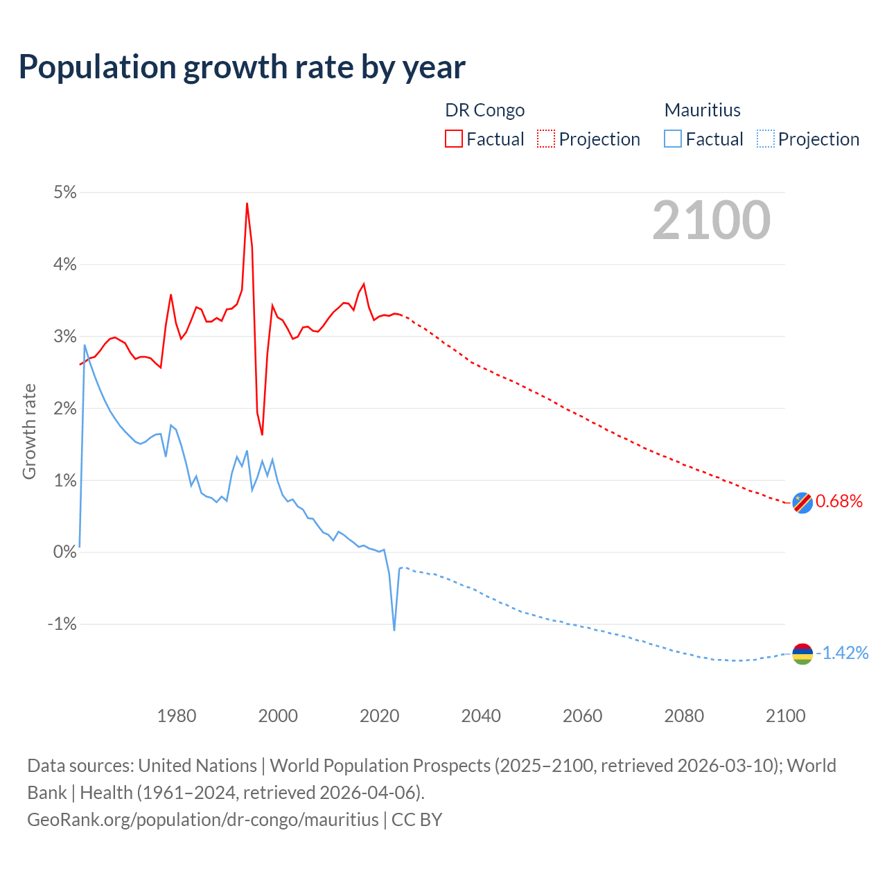 - For the last 10 years, the DR Congo has had an average growth rate of +3.38% per year vs -0.09% in Mauritius.