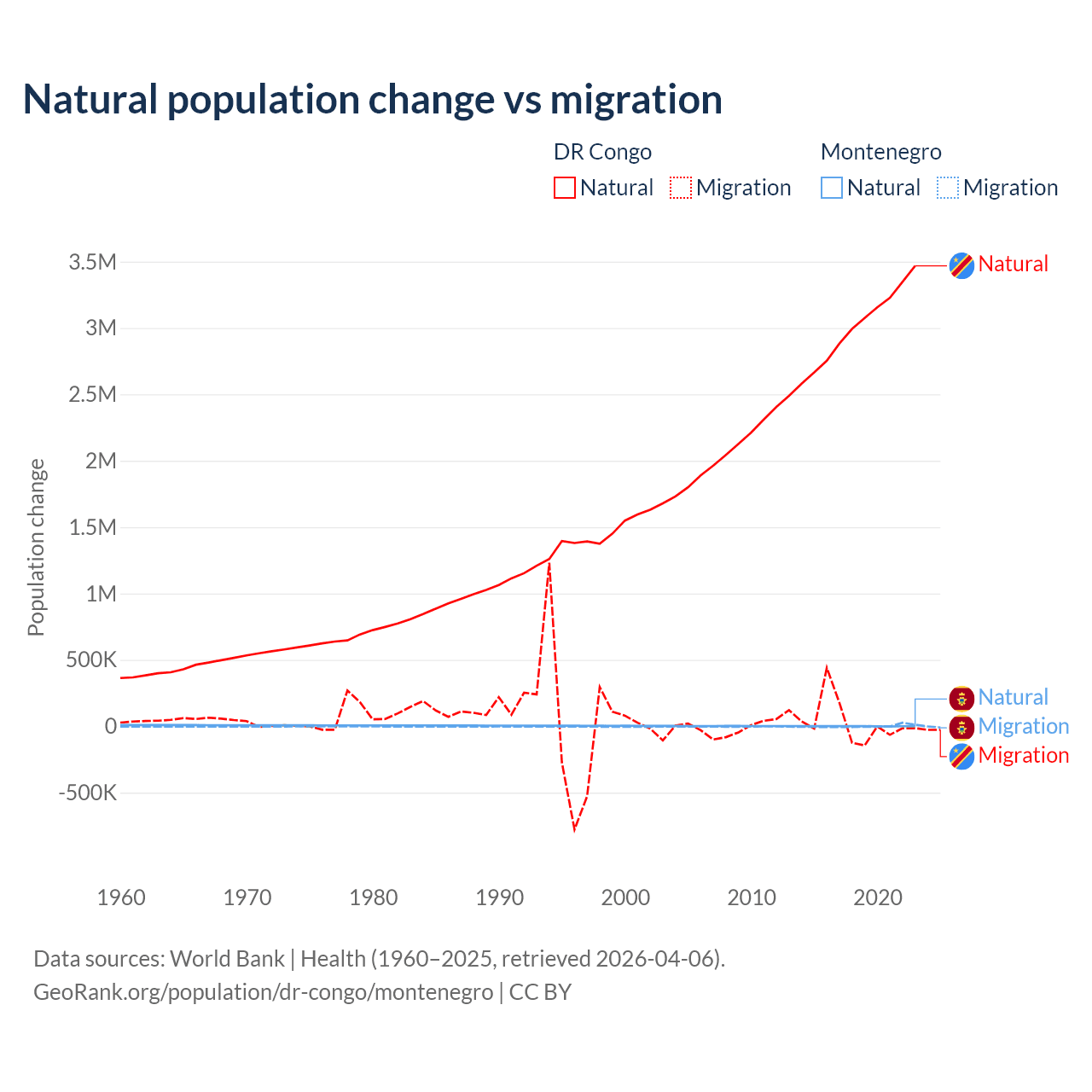 Over the last 10 years, 99.1% of the population change in the DR Congo is from natural causes (a gain of 30,150,516 people) and 0.89% is from migration (a gain of 270,872 people). In Montenegro 52.4% is from natural causes (a gain of 4,501 people) and 47.6% is from migration (a gain of 4,095 people).