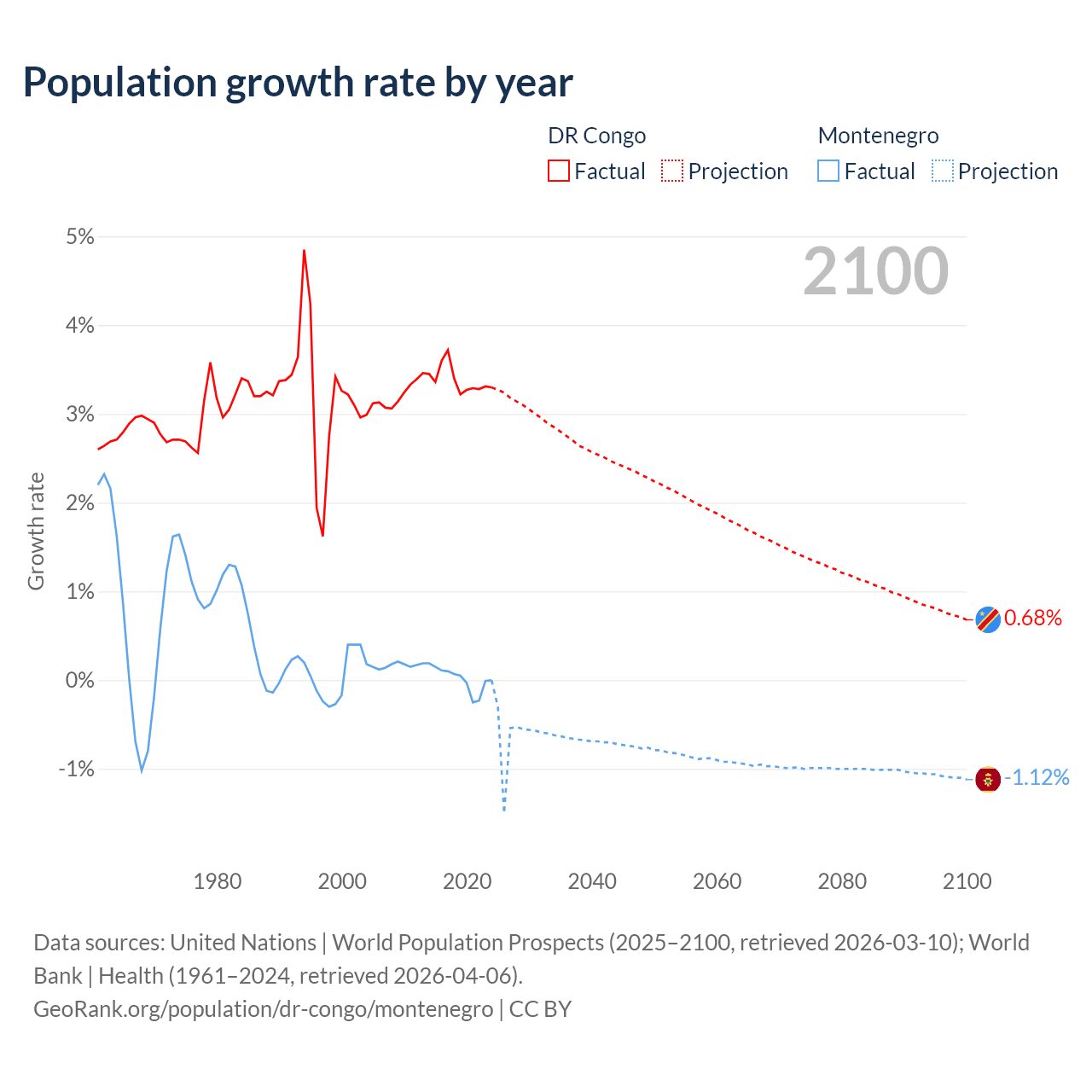 - For the last 10 years, the DR Congo has had an average growth rate of +3.38% per year vs +0.01% in Montenegro.