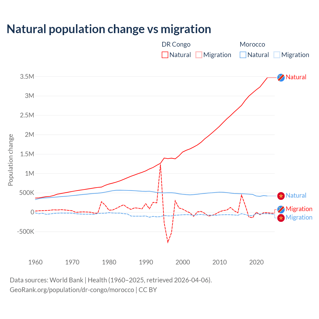Over the last 10 years, 99.1% of the population change in the DR Congo is from natural causes (a gain of 30,150,516 people) and 0.89% is from migration (a gain of 270,872 people). In Morocco 88.3% is from natural causes (a gain of 4,495,223 people) and 11.7% is from migration (a loss of 594,083 people).
