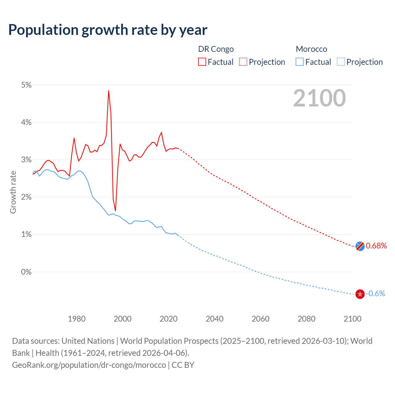 - For the last 10 years, the DR Congo has had an average growth rate of +3.38% per year vs +1.09% in Morocco.