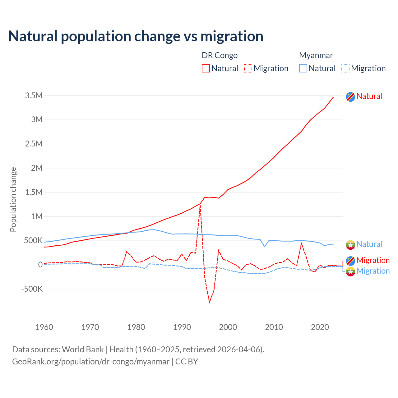 Over the last 10 years, 99.1% of the population change in the DR Congo is from natural causes (a gain of 30,150,516 people) and 0.89% is from migration (a gain of 270,872 people). In Myanmar 86% is from natural causes (a gain of 4,594,615 people) and 14% is from migration (a loss of 749,272 people).