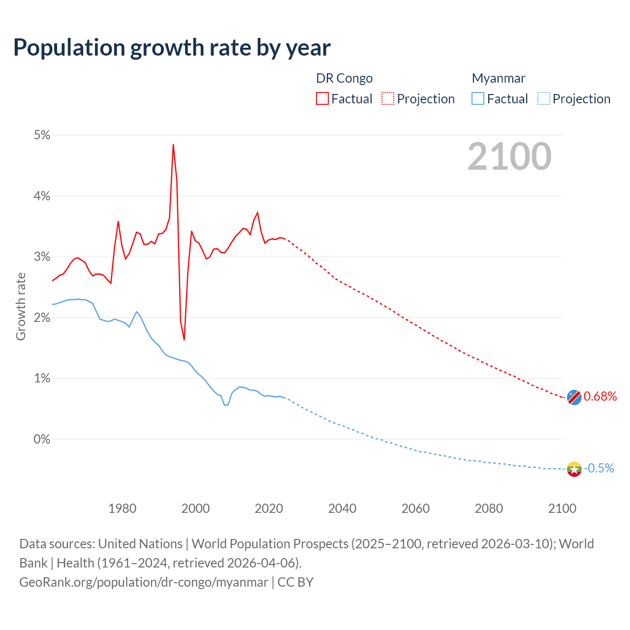 - For the last 10 years, the DR Congo has had an average growth rate of +3.38% per year vs +0.74% in Myanmar.
