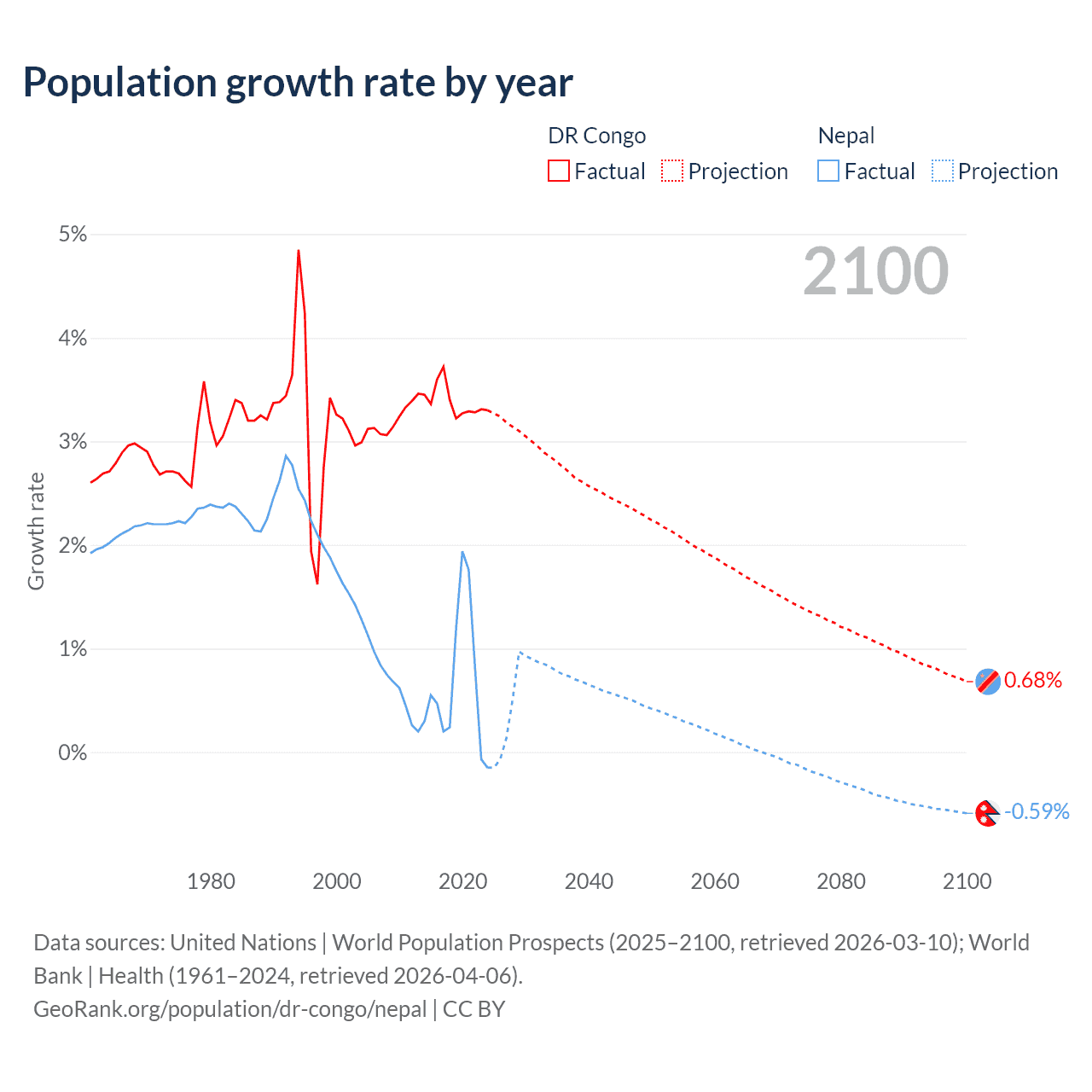 - For the last 10 years, the DR Congo has had an average growth rate of +3.38% per year vs +0.66% in Nepal.