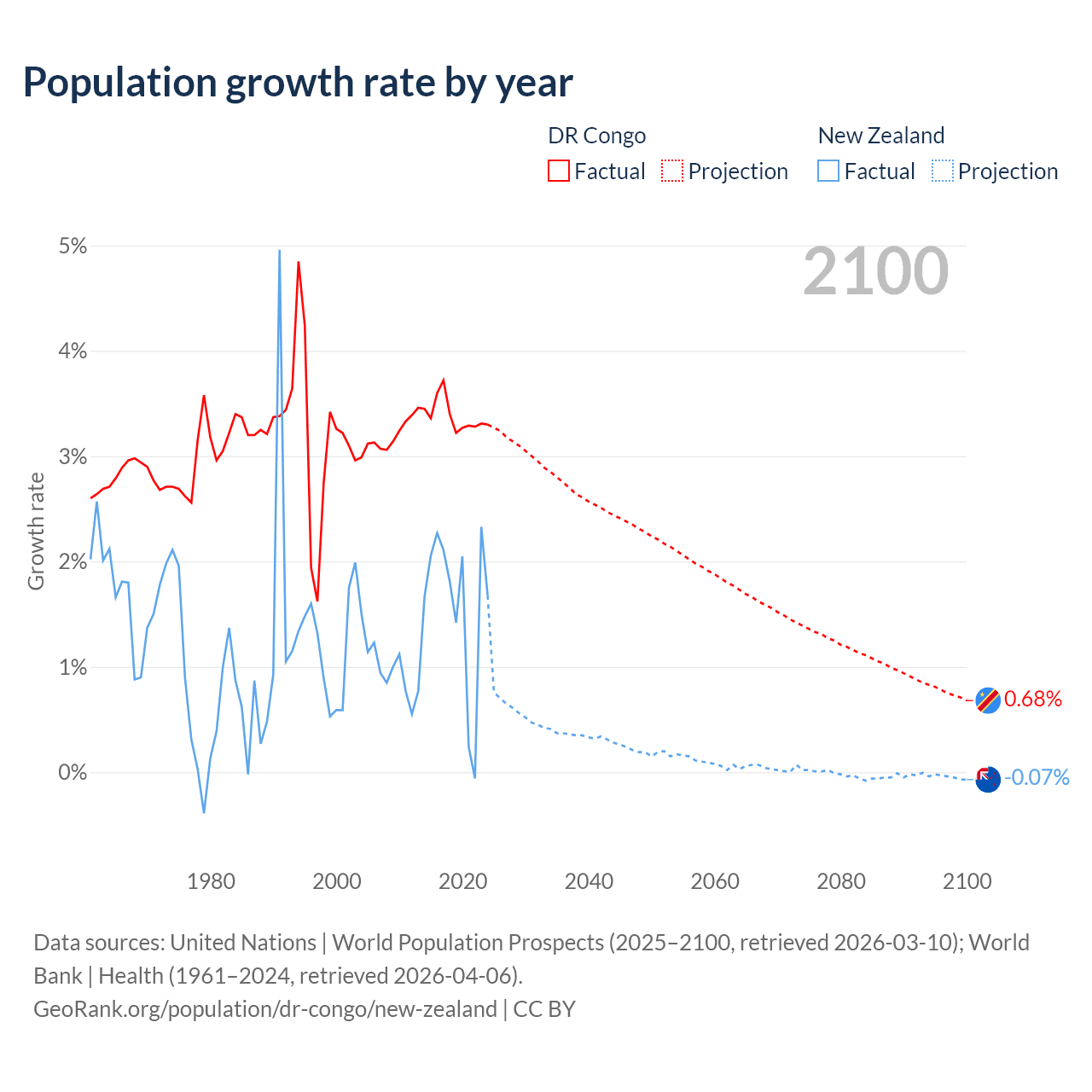 DR Congo vs New Zealand: population by year and forecast