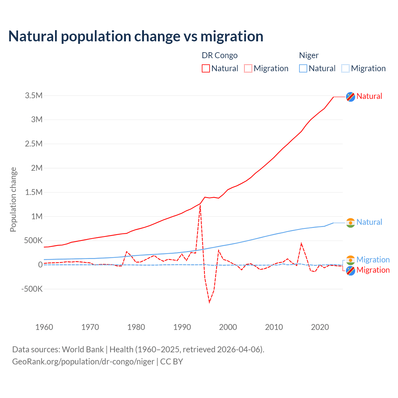 Over the last 10 years, 99.1% of the population change in the DR Congo is from natural causes (a gain of 30,150,516 people) and 0.89% is from migration (a gain of 270,872 people). In Niger 100% is from natural causes (a gain of 7,728,287 people) and 0.03% is from migration (a gain of 2,520 people).