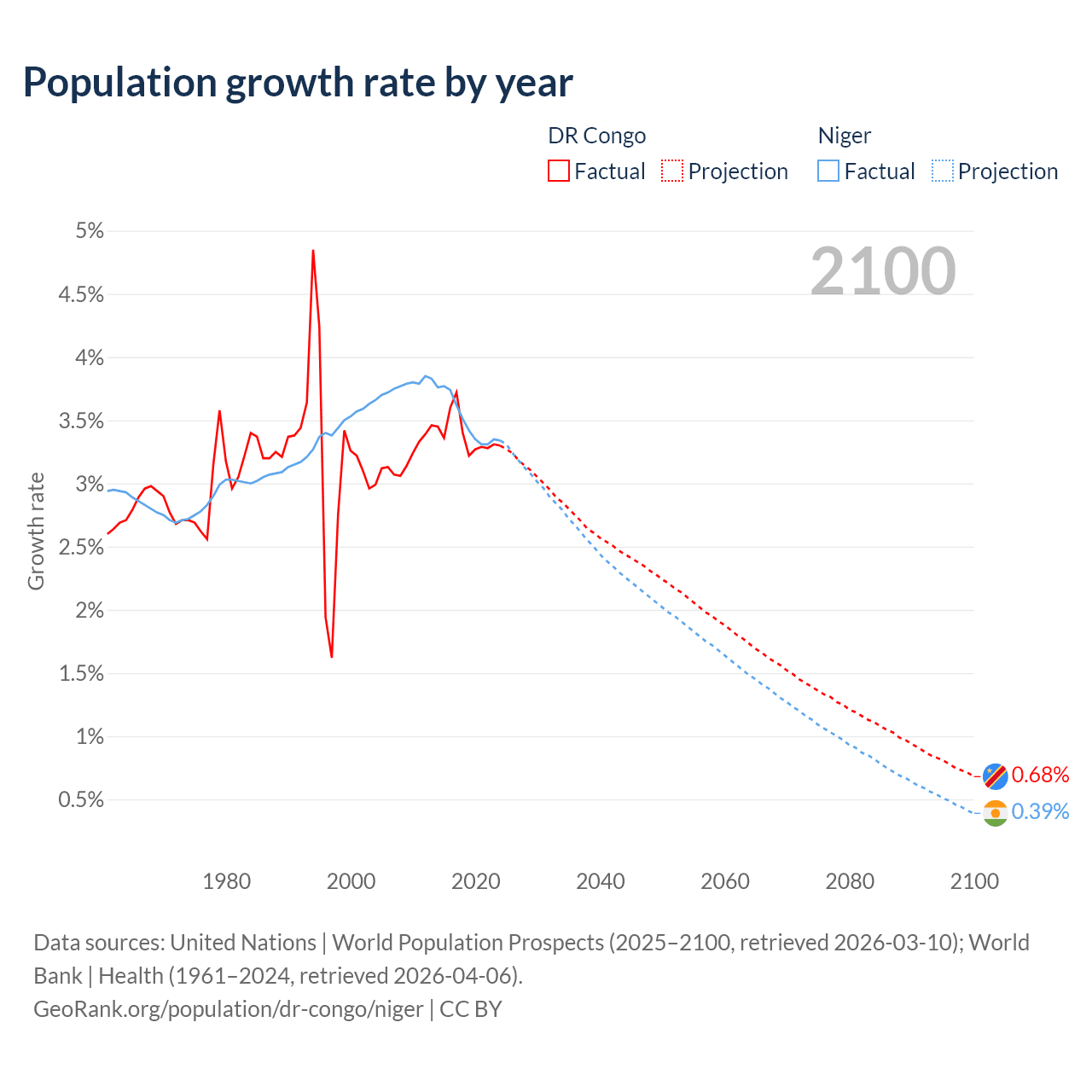- For the last 10 years, the DR Congo has had an average growth rate of +3.38% per year vs +3.5% in Niger.