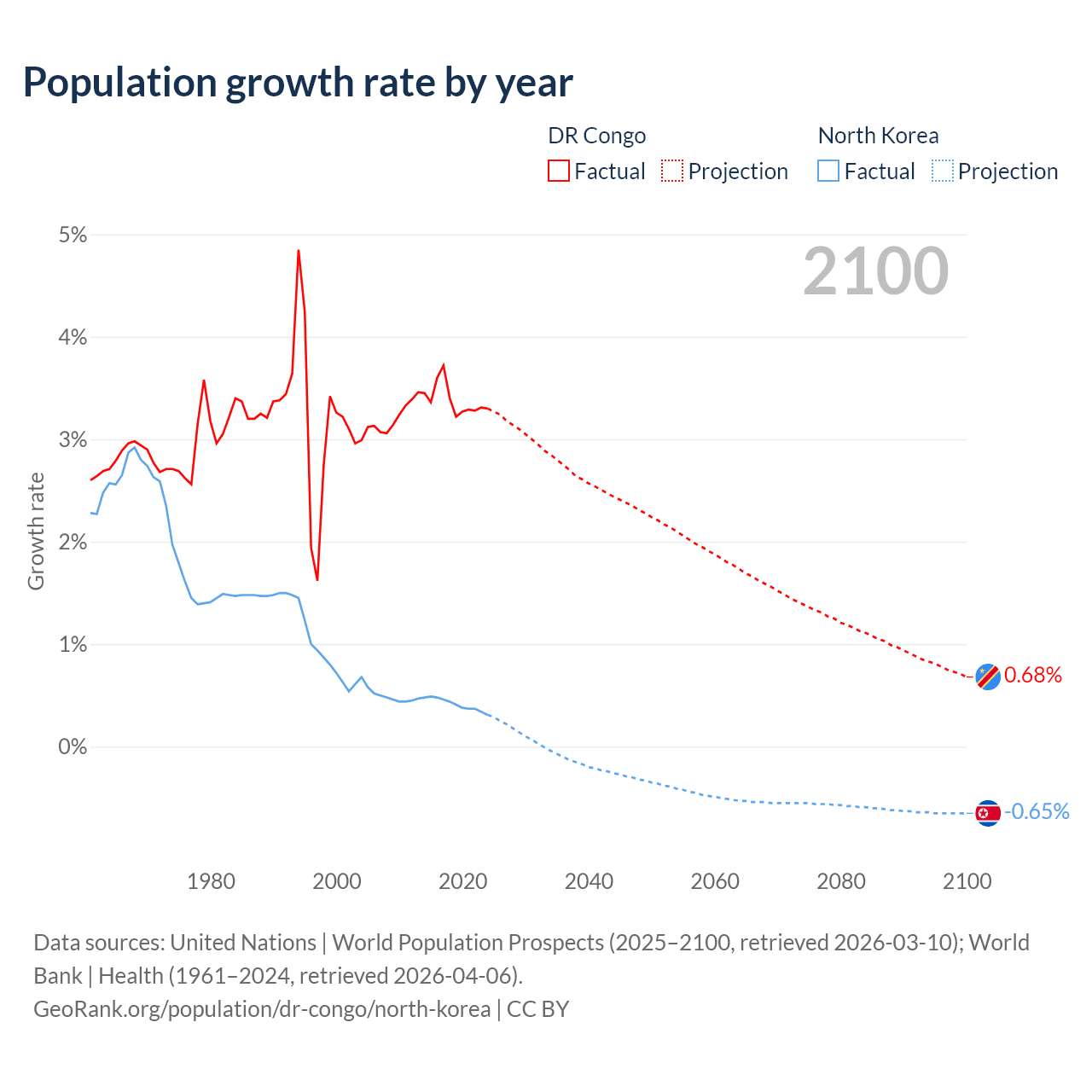 - For the last 10 years, the DR Congo has had an average growth rate of +3.38% per year vs +0.41% in North Korea.