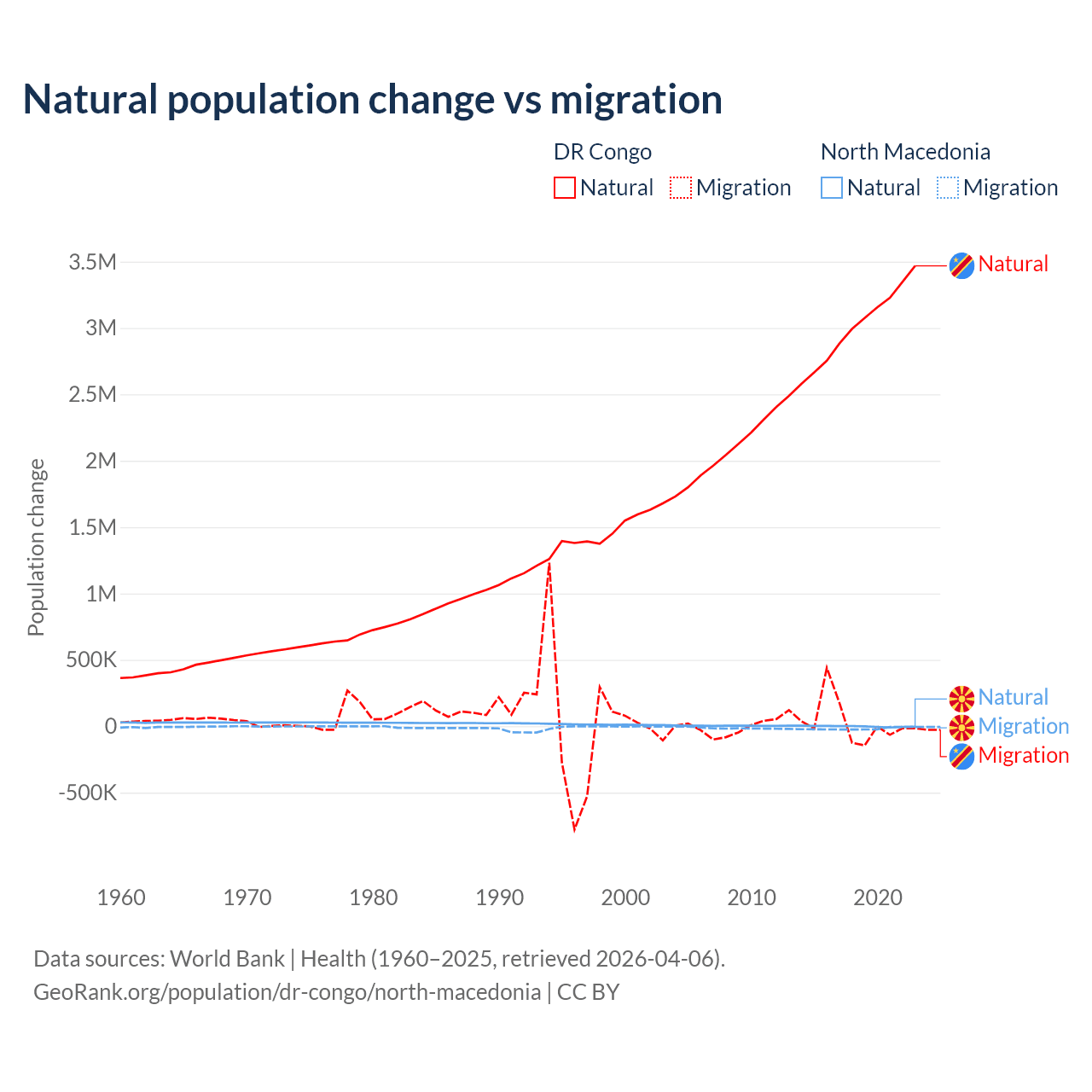 Over the last 10 years, 99.1% of the population change in the DR Congo is from natural causes (a gain of 30,150,516 people) and 0.89% is from migration (a gain of 270,872 people). In North Macedonia 6.45% is from natural causes (a loss of 12,585 people) and 93.5% is from migration (a loss of 182,429 people).