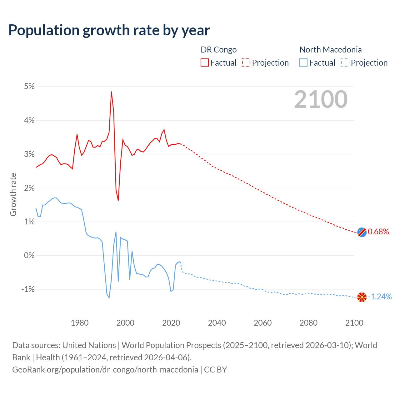 - For the last 10 years, the DR Congo has had an average growth rate of +3.38% per year vs -0.48% in North Macedonia.