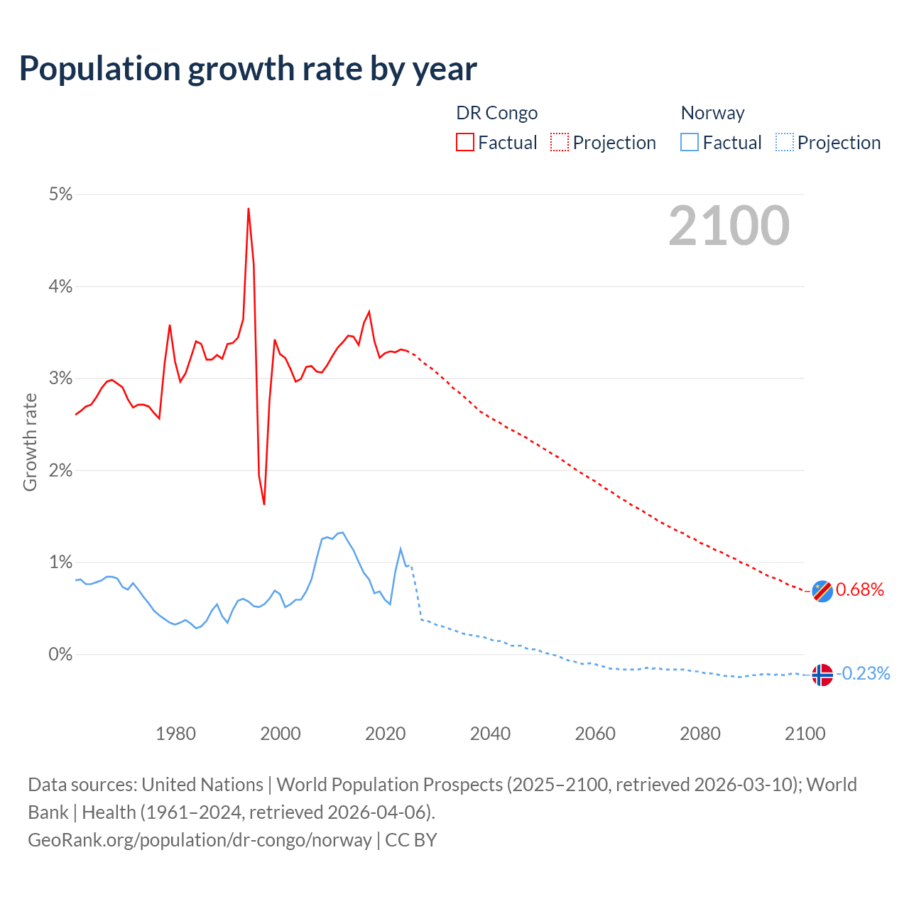 - For the last 10 years, the DR Congo has had an average growth rate of +3.38% per year vs +0.85% in Norway.