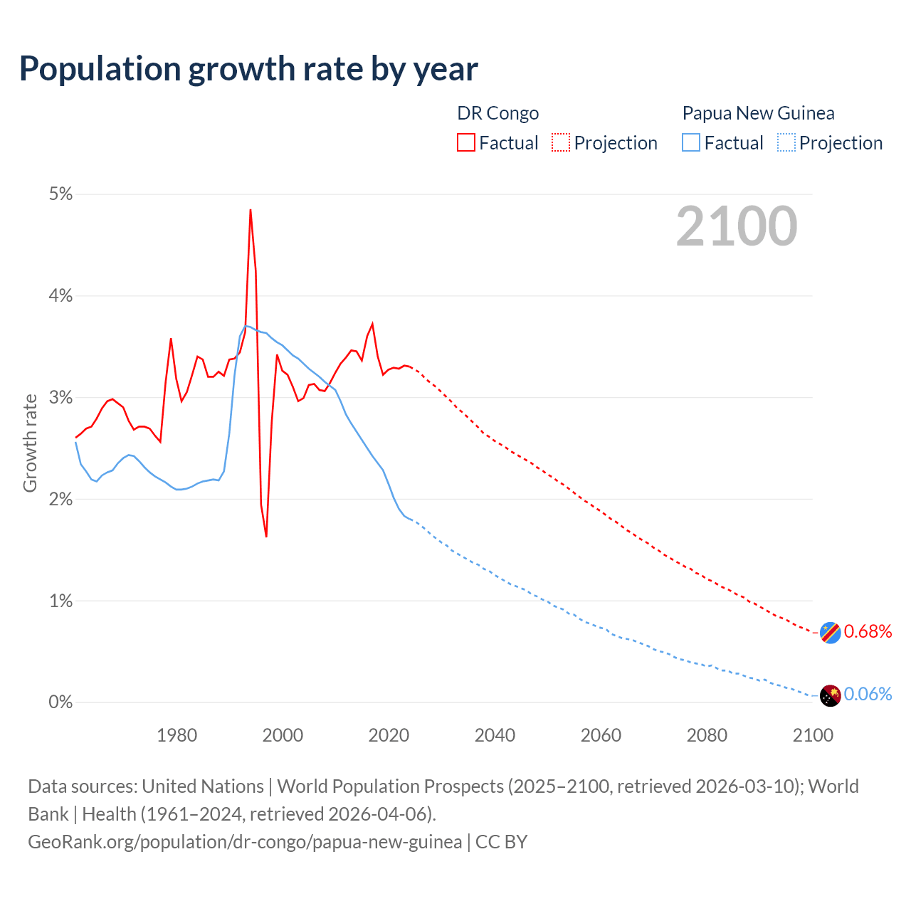 - For the last 10 years, the DR Congo has had an average growth rate of +3.38% per year vs +2.23% in Papua New Guinea.