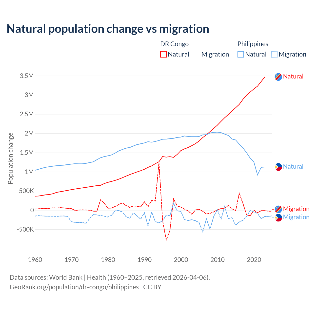 Over the last 10 years, 99.1% of the population change in the DR Congo is from natural causes (a gain of 30,150,516 people) and 0.89% is from migration (a gain of 270,872 people). In the Philippines 88.5% is from natural causes (a gain of 14,279,705 people) and 11.5% is from migration (a loss of 1,848,117 people).