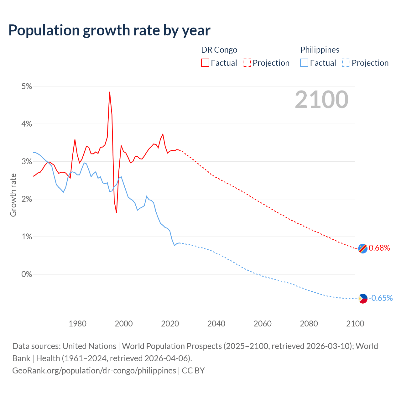 - For the last 10 years, the DR Congo has had an average growth rate of +3.38% per year vs +1.16% in the Philippines.