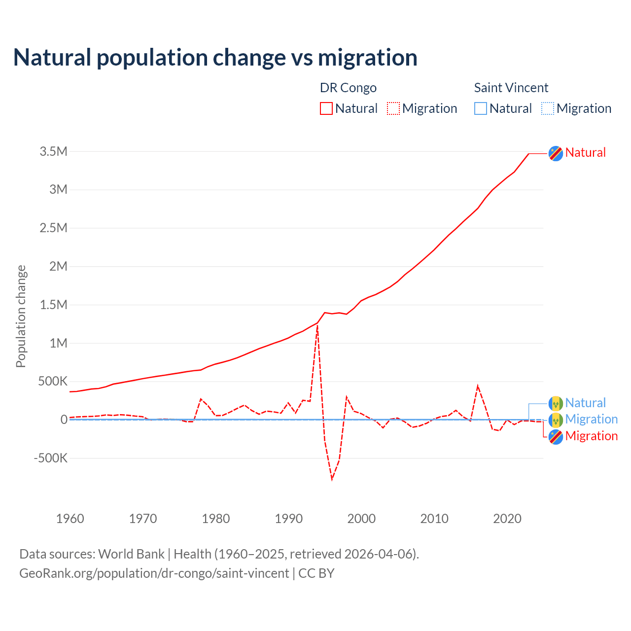 Over the last 10 years, 99.1% of the population change in the DR Congo is from natural causes (a gain of 30,150,516 people) and 0.89% is from migration (a gain of 270,872 people). In Saint Vincent 21.2% is from natural causes (a gain of 2,525 people) and 78.8% is from migration (a loss of 9,393 people).