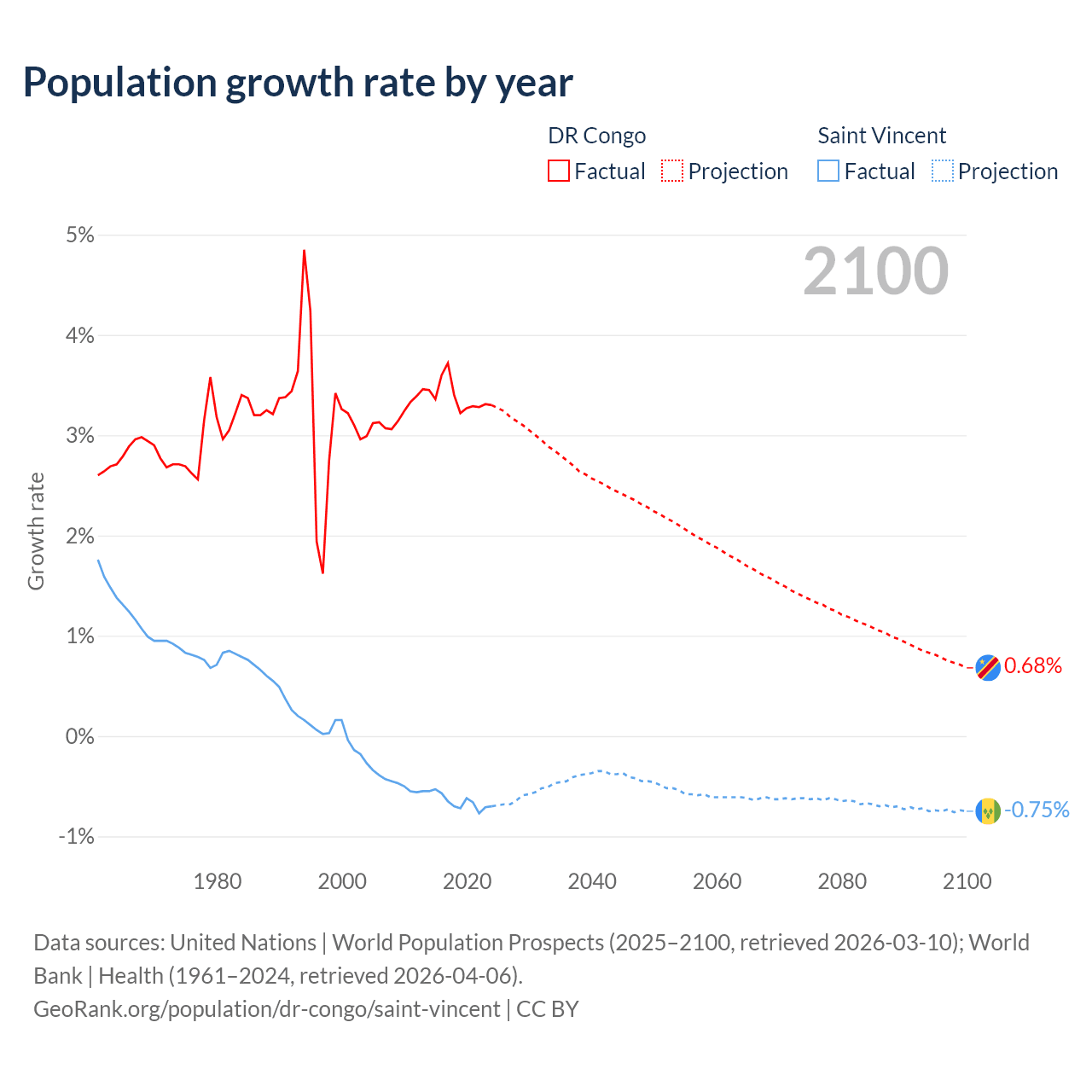 - For the last 10 years, the DR Congo has had an average growth rate of +3.38% per year vs -0.65% in Saint Vincent.