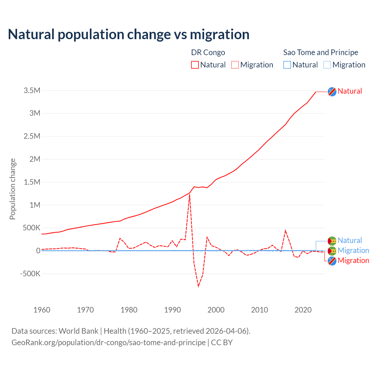 Over the last 10 years, 99.1% of the population change in the DR Congo is from natural causes (a gain of 30,150,516 people) and 0.89% is from migration (a gain of 270,872 people). In Sao Tome and Principe 80.1% is from natural causes (a gain of 50,822 people) and 19.9% is from migration (a loss of 12,621 people).