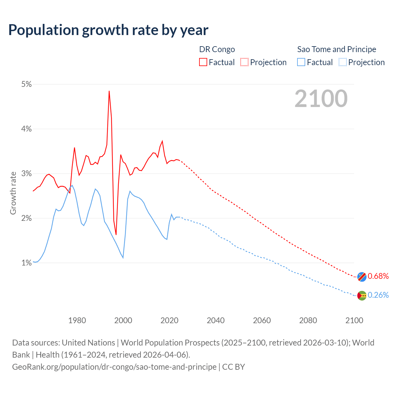 - For the last 10 years, the DR Congo has had an average growth rate of +3.38% per year vs +1.82% in Sao Tome and Principe.