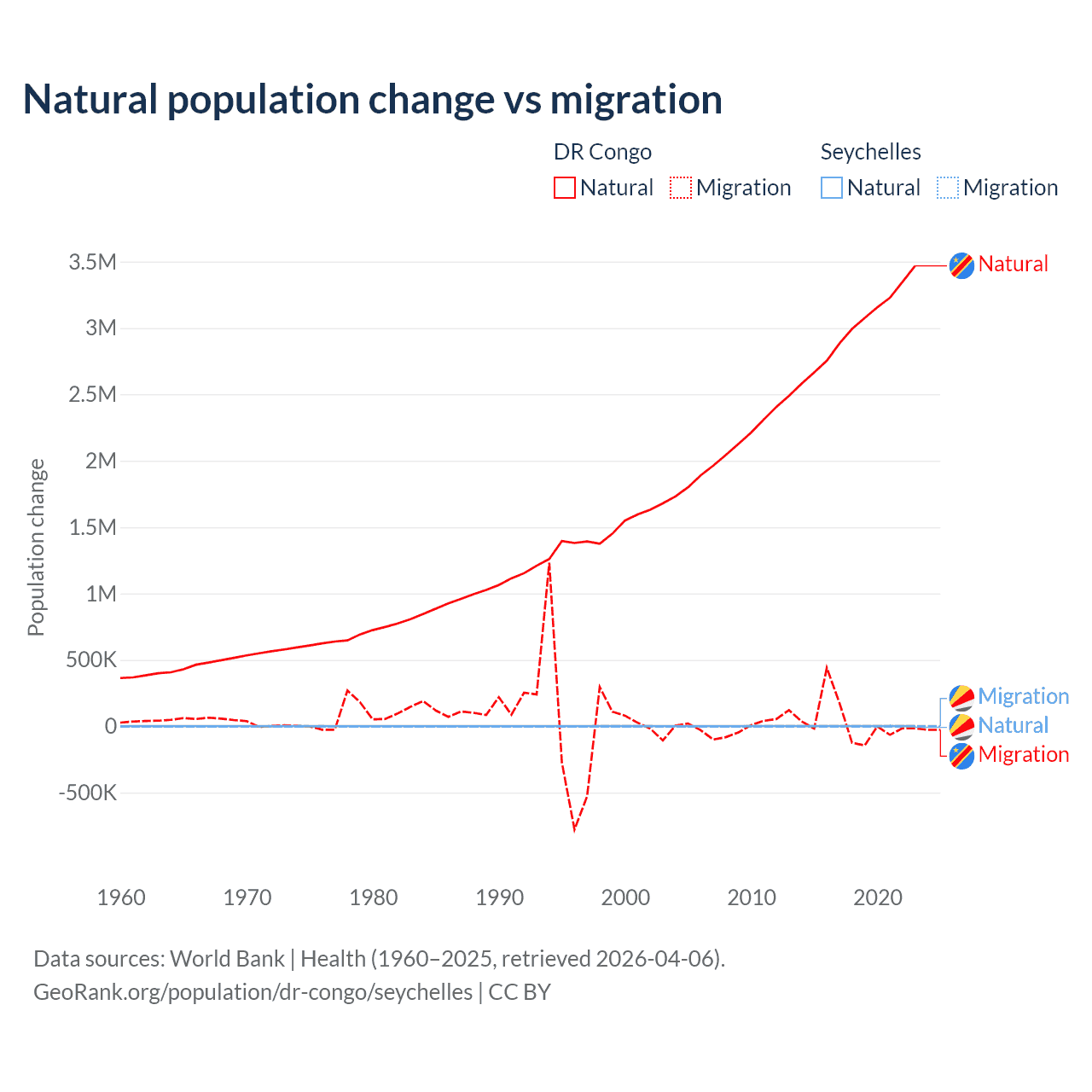Over the last 10 years, 99.1% of the population change in the DR Congo is from natural causes (a gain of 30,150,516 people) and 0.89% is from migration (a gain of 270,872 people). In the Seychelles 31.4% is from natural causes (a gain of 8,122 people) and 68.6% is from migration (a gain of 17,748 people).