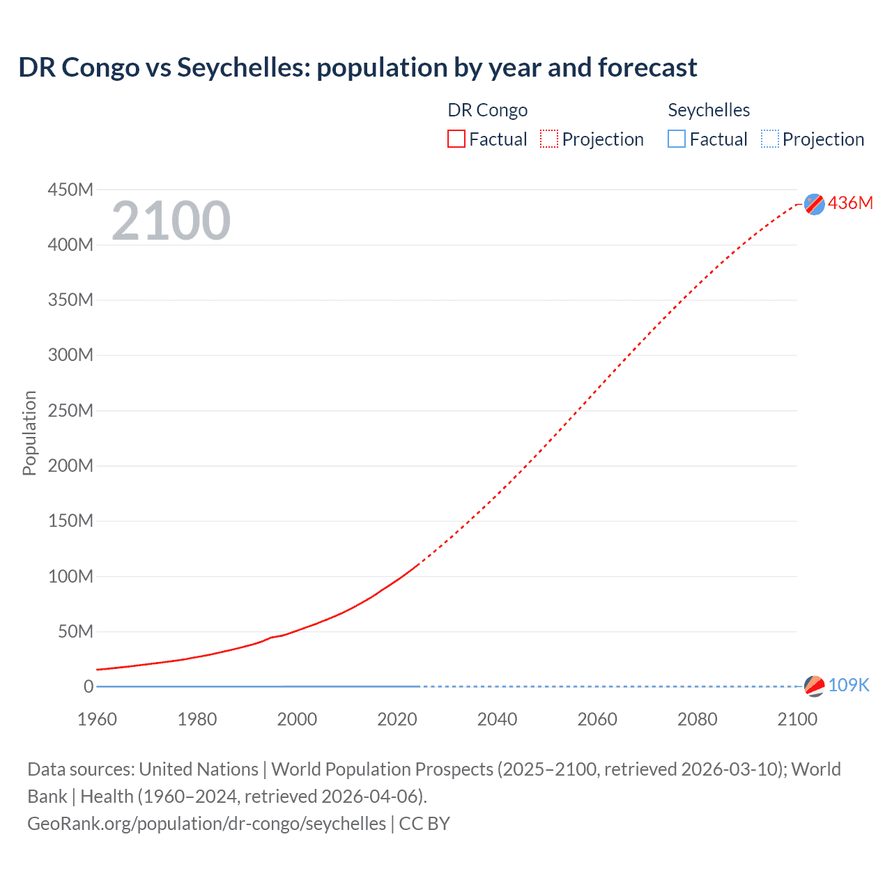 The latest officially reported population of the DR Congo was 109,276,265 in 2024 vs 121,354 people in the Seychelles in 2024. In 2026, based on the adjusted UN estimation, the current DR Congo's population is 117,507,801 people compared to 126,311 in the Seychelles.