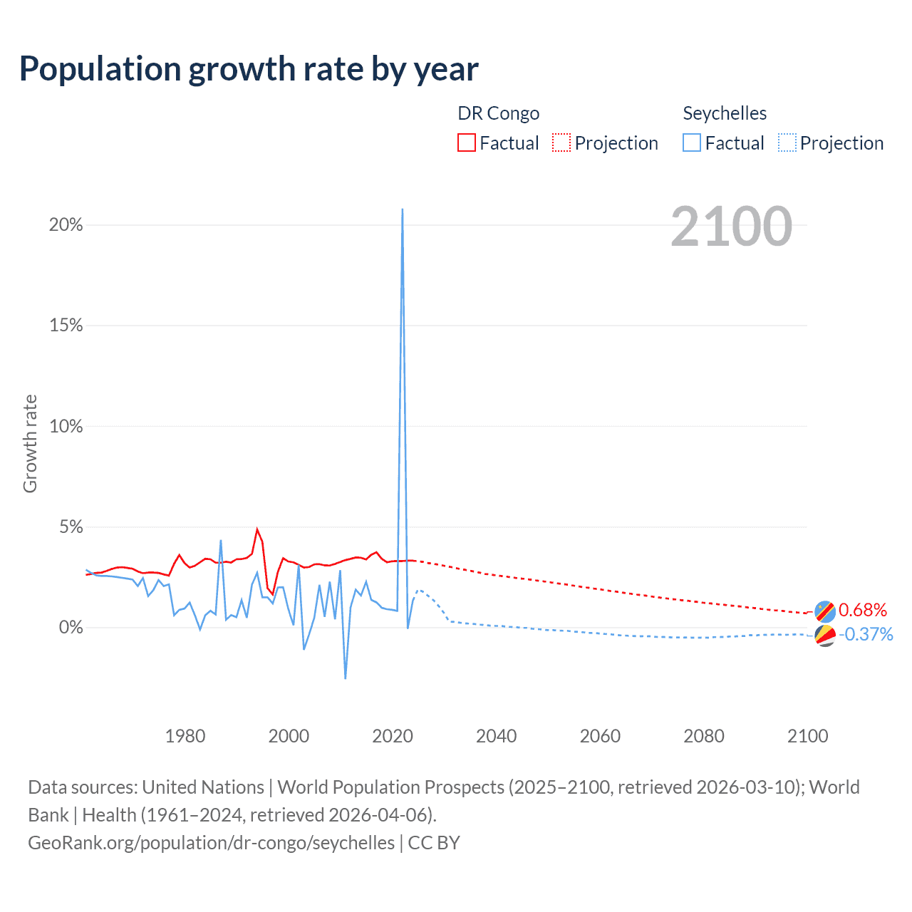 - For the last 10 years, the DR Congo has had an average growth rate of +3.38% per year vs +2.9% in the Seychelles.