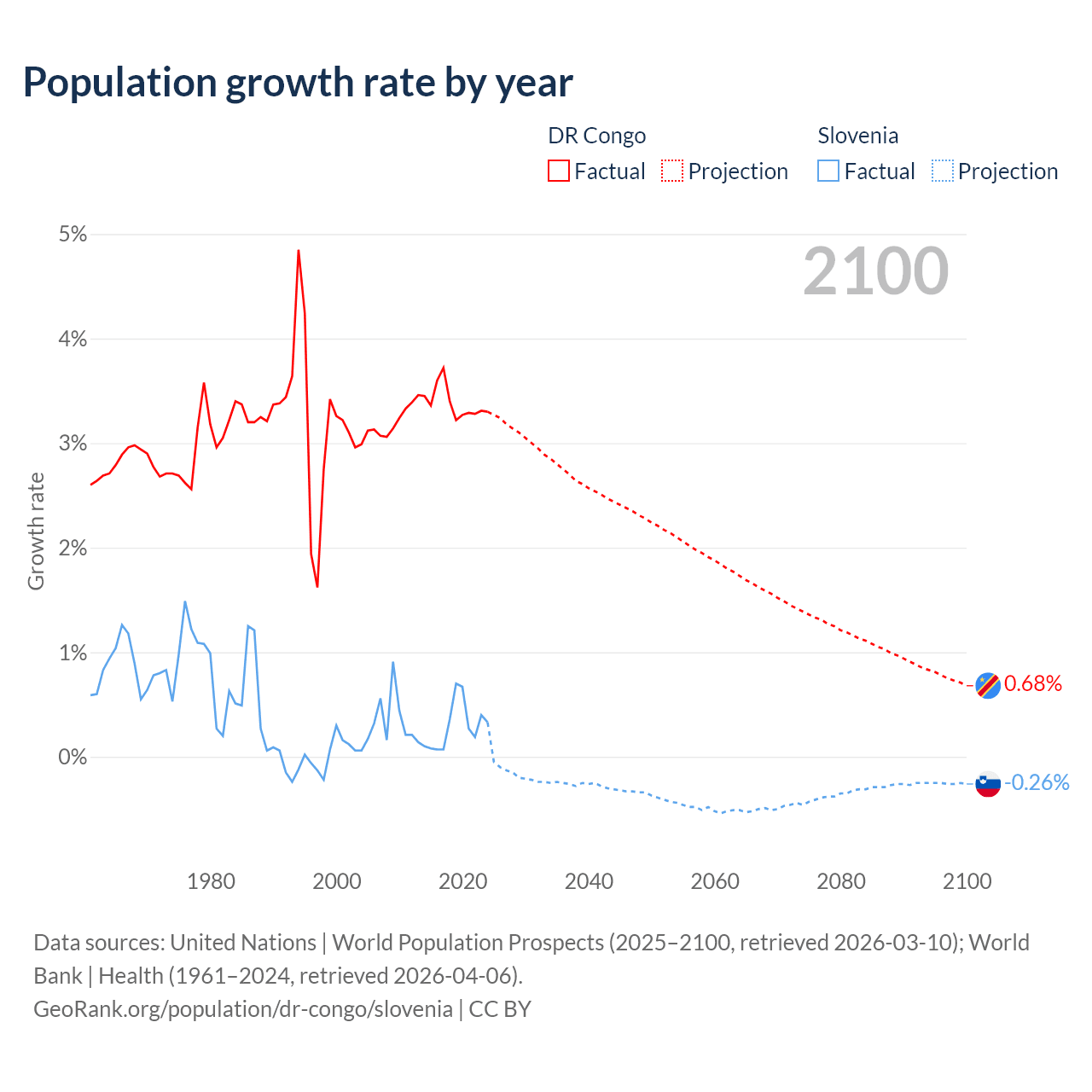 - For the last 10 years, the DR Congo has had an average growth rate of +3.38% per year vs +0.29% in Slovenia.