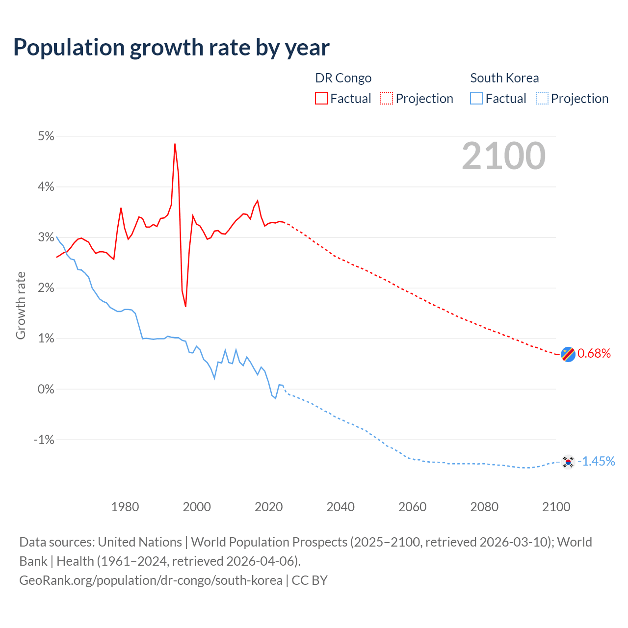 - For the last 10 years, the DR Congo has had an average growth rate of +3.38% per year vs +0.24% in South Korea.