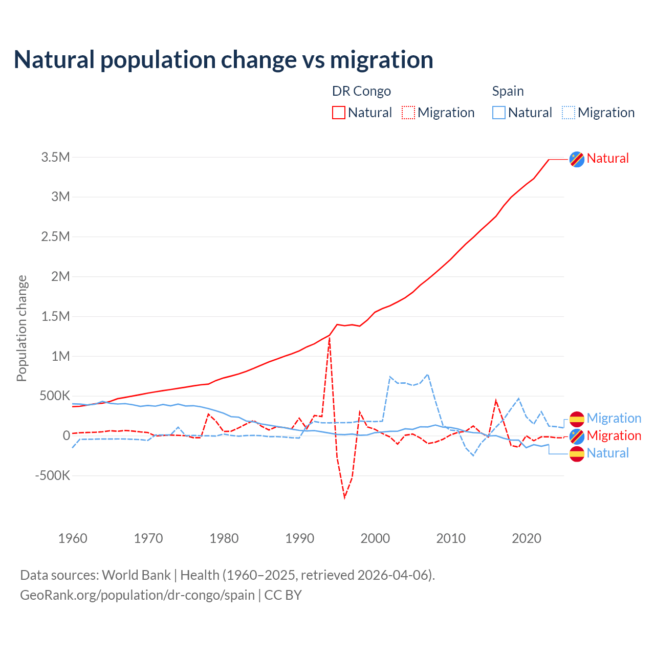 Over the last 10 years, 99.1% of the population change in the DR Congo is from natural causes (a gain of 30,150,516 people) and 0.89% is from migration (a gain of 270,872 people). In Spain 25.8% is from natural causes (a loss of 627,829 people) and 74.2% is from migration (a gain of 1,810,127 people).