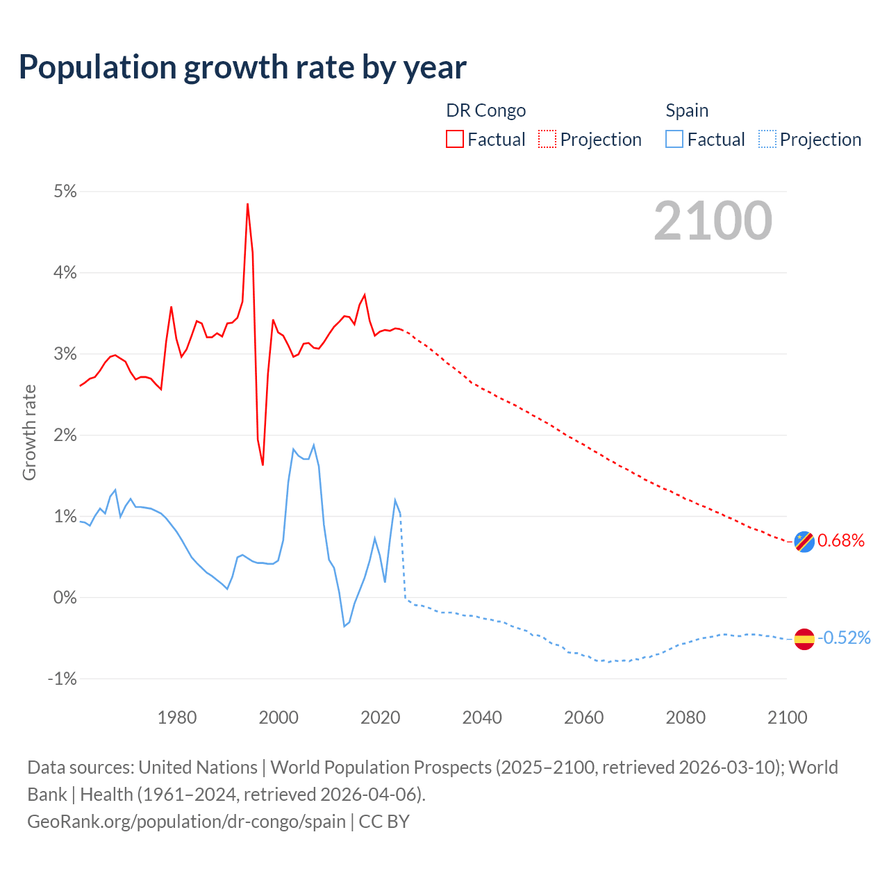 - For the last 10 years, the DR Congo has had an average growth rate of +3.38% per year vs +0.43% in Spain.