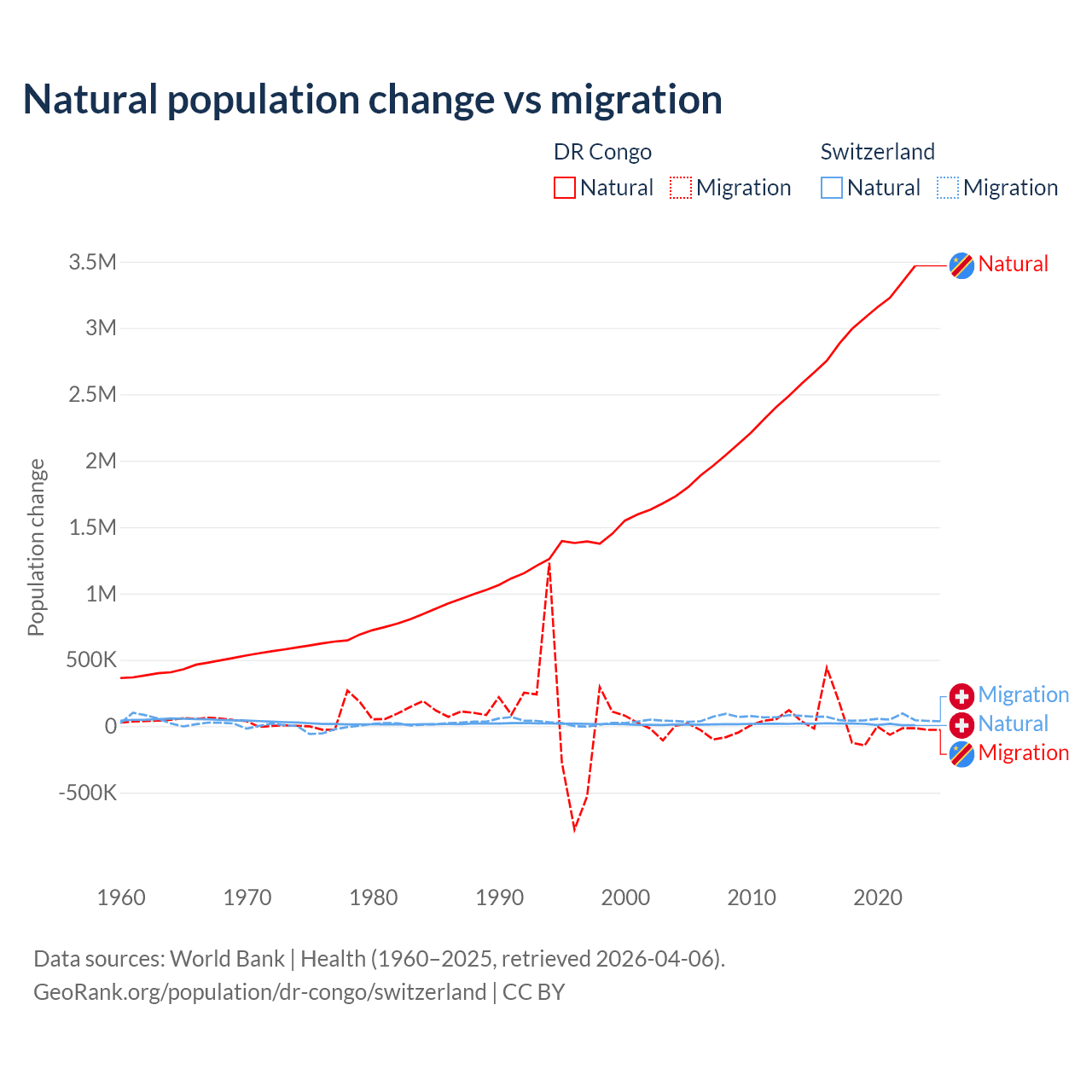 Over the last 10 years, 99.1% of the population change in the DR Congo is from natural causes (a gain of 30,150,516 people) and 0.89% is from migration (a gain of 270,872 people). In Switzerland 21.6% is from natural causes (a gain of 165,354 people) and 78.4% is from migration (a gain of 600,145 people).