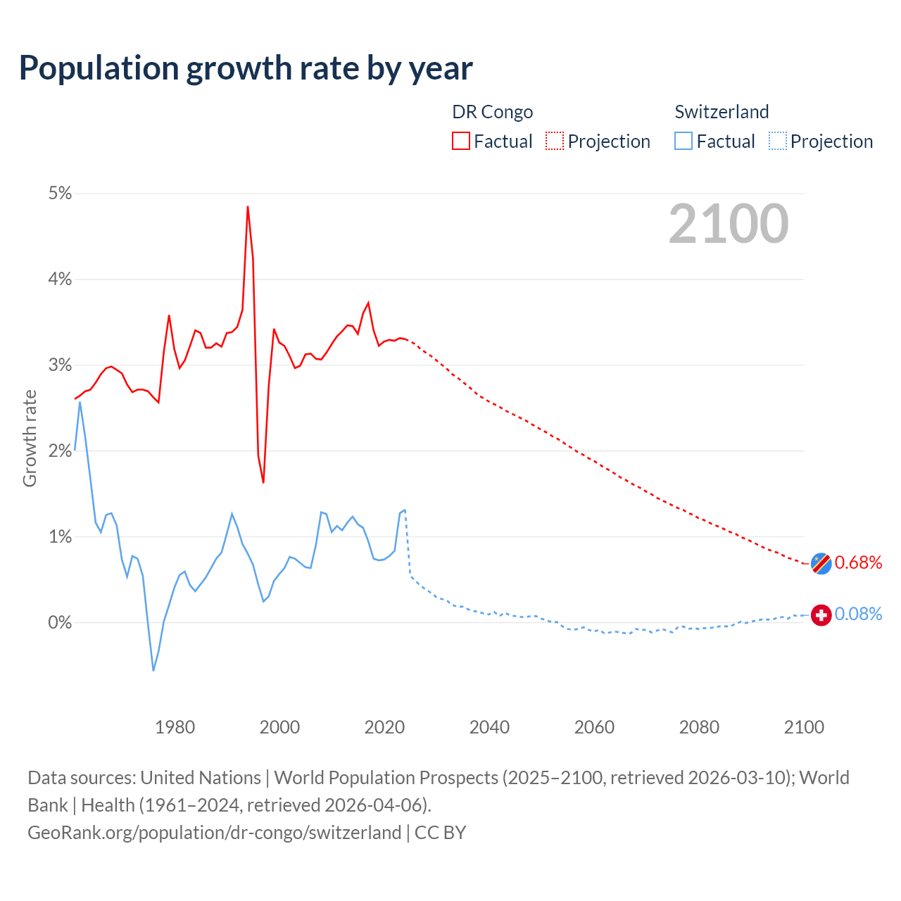 - For the last 10 years, the DR Congo has had an average growth rate of +3.38% per year vs +0.98% in Switzerland.