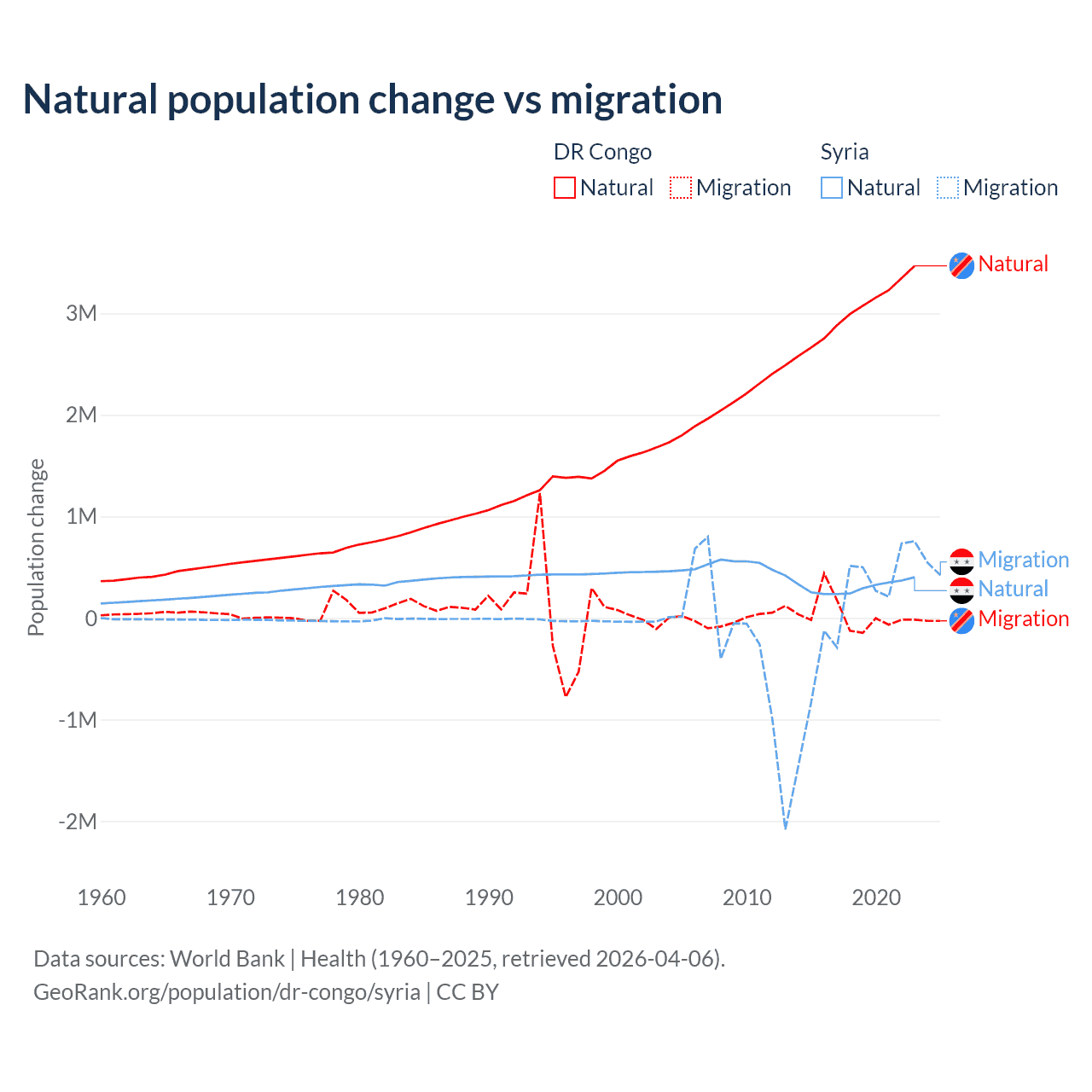 Over the last 10 years, 99.1% of the population change in the DR Congo is from natural causes (a gain of 30,150,516 people) and 0.89% is from migration (a gain of 270,872 people). In Syria 91.3% is from natural causes (a gain of 3,047,621 people) and 8.72% is from migration (a gain of 291,069 people).