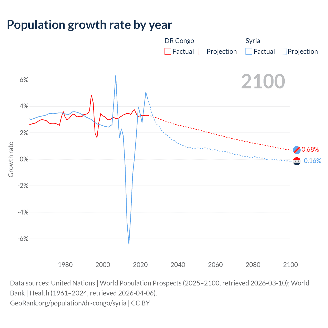 - For the last 10 years, the DR Congo has had an average growth rate of +3.38% per year vs +1.25% in Syria.