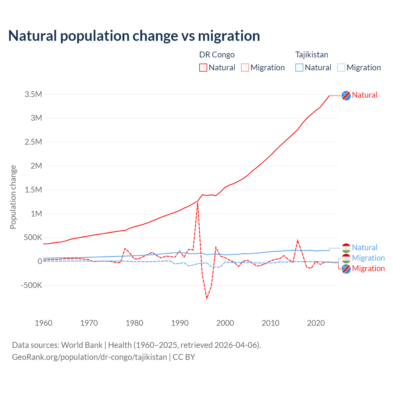 Over the last 10 years, 99.1% of the population change in the DR Congo is from natural causes (a gain of 30,150,516 people) and 0.89% is from migration (a gain of 270,872 people). In Tajikistan 96% is from natural causes (a gain of 2,266,045 people) and 3.95% is from migration (a loss of 93,205 people).