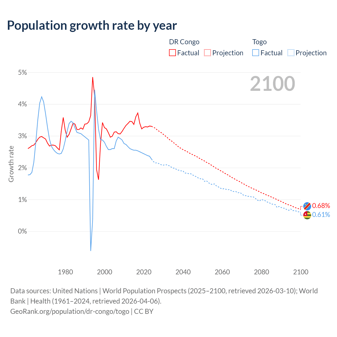 - For the last 10 years, the DR Congo has had an average growth rate of +3.38% per year vs +2.46% in Togo.