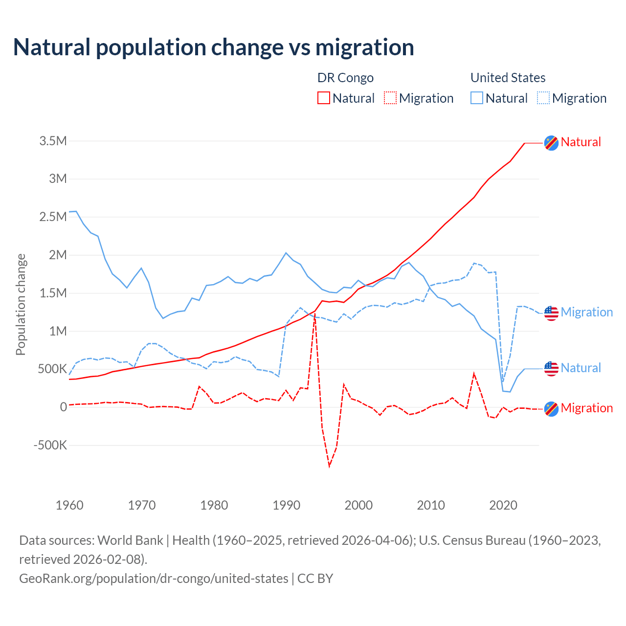 Over the last 10 years, 99.1% of the population change in the DR Congo is from natural causes (a gain of 30,150,516 people) and 0.89% is from migration (a gain of 270,872 people). In the United States 35.8% is from natural causes (a gain of 8,005,866 people) and 64.2% is from migration (a gain of 14,334,286 people).