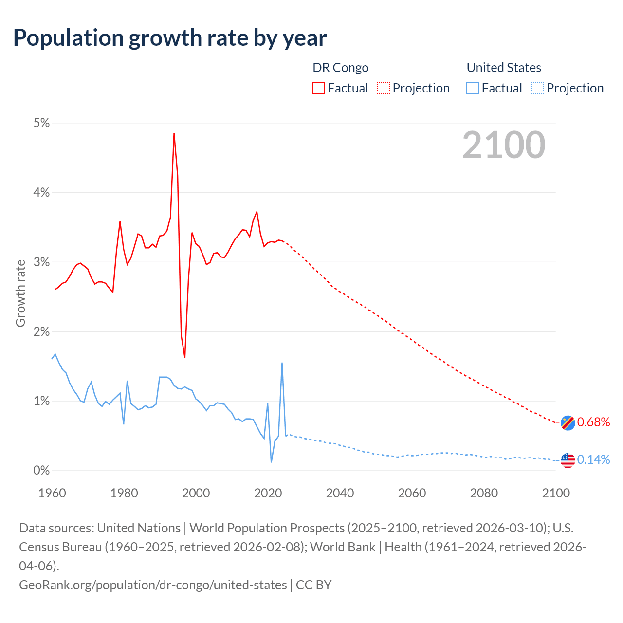 Data sources: World Bank | Health (1960–2024, retrieved 2026-04-06); United Nations | World Population Prospects (1960–2026, retrieved 2026-03-10); U.S. Census Bureau (1960–2025, retrieved 2026-02-08); Central Intelligence Agency (CIA) (2000–2019, retrieved 2026-02-20).