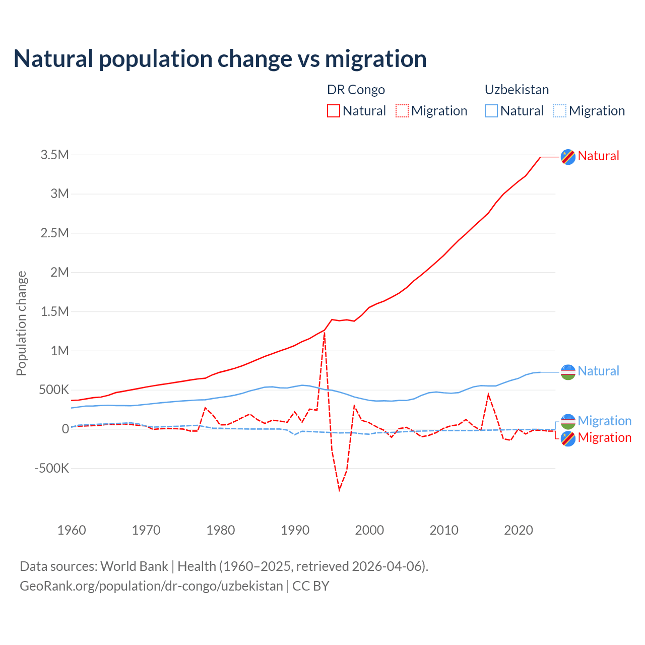 Over the last 10 years, 99.1% of the population change in the DR Congo is from natural causes (a gain of 30,150,516 people) and 0.89% is from migration (a gain of 270,872 people). In Uzbekistan 98.2% is from natural causes (a gain of 6,161,117 people) and 1.84% is from migration (a loss of 115,398 people).