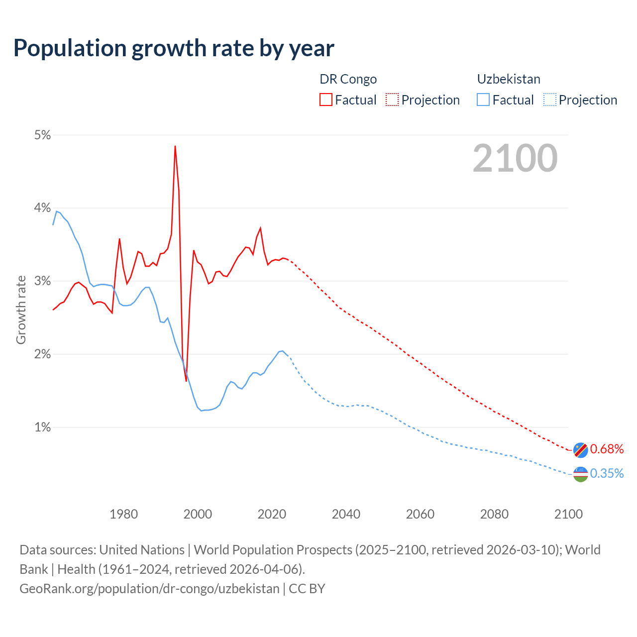 DR Congo vs Uzbekistan: population by year and forecast