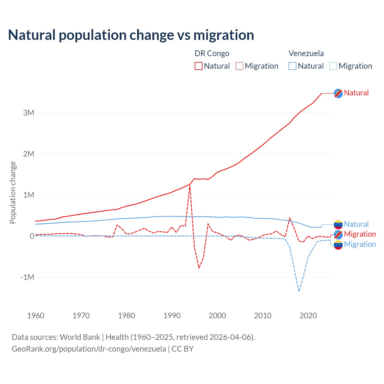 Over the last 10 years, 99.1% of the population change in the DR Congo is from natural causes (a gain of 30,150,516 people) and 0.89% is from migration (a gain of 270,872 people). In Venezuela 38.6% is from natural causes (a gain of 2,946,257 people) and 61.4% is from migration (a loss of 4,683,227 people).