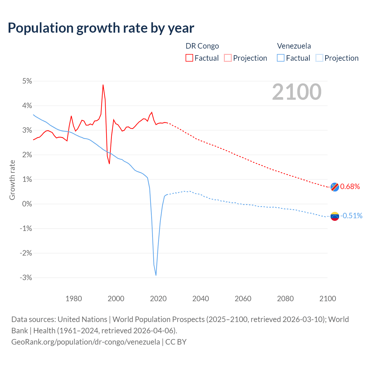- For the last 10 years, the DR Congo has had an average growth rate of +3.38% per year vs -0.46% in Venezuela.