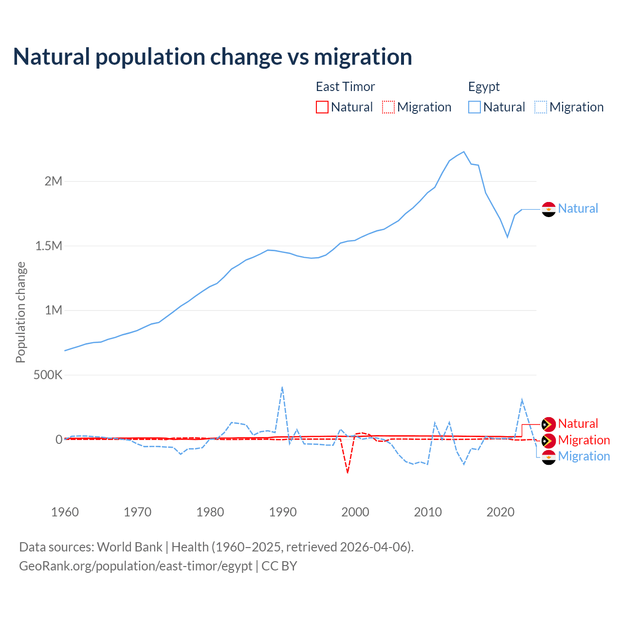 Over the last 10 years, 98.3% of the population change in East Timor is from natural causes (a gain of 217,698 people) and 1.66% is from migration (a gain of 3,665 people). In Egypt 99.6% is from natural causes (a gain of 19,180,073 people) and 0.41% is from migration (a loss of 78,975 people).