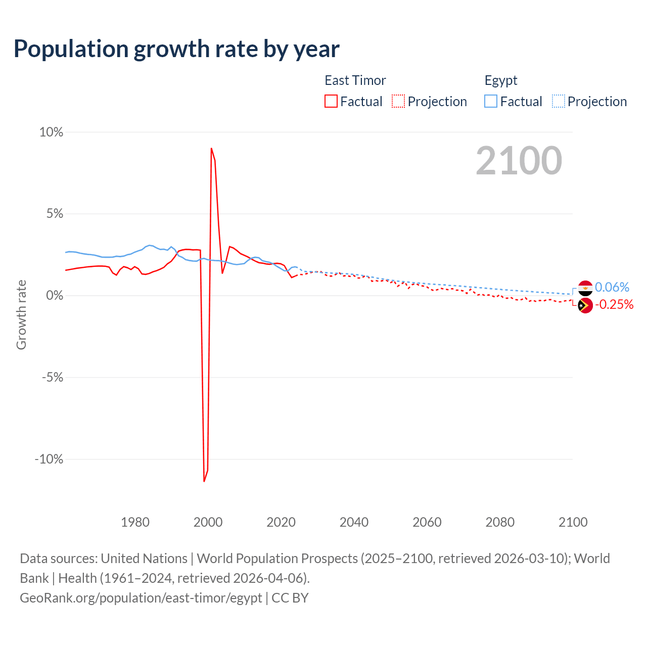 - For the last 10 years, East Timor has had an average growth rate of +1.74% per year vs +1.84% in Egypt.
