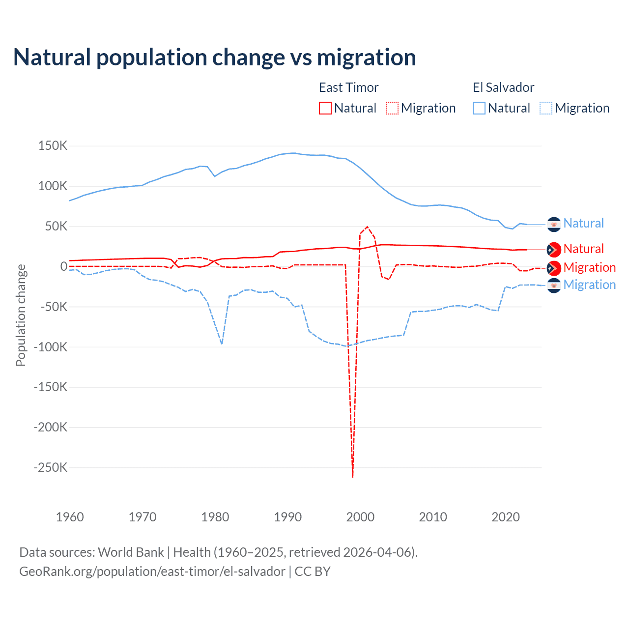 Over the last 10 years, 98.3% of the population change in East Timor is from natural causes (a gain of 217,698 people) and 1.66% is from migration (a gain of 3,665 people). In El Salvador 58.8% is from natural causes (a gain of 579,641 people) and 41.2% is from migration (a loss of 406,874 people).