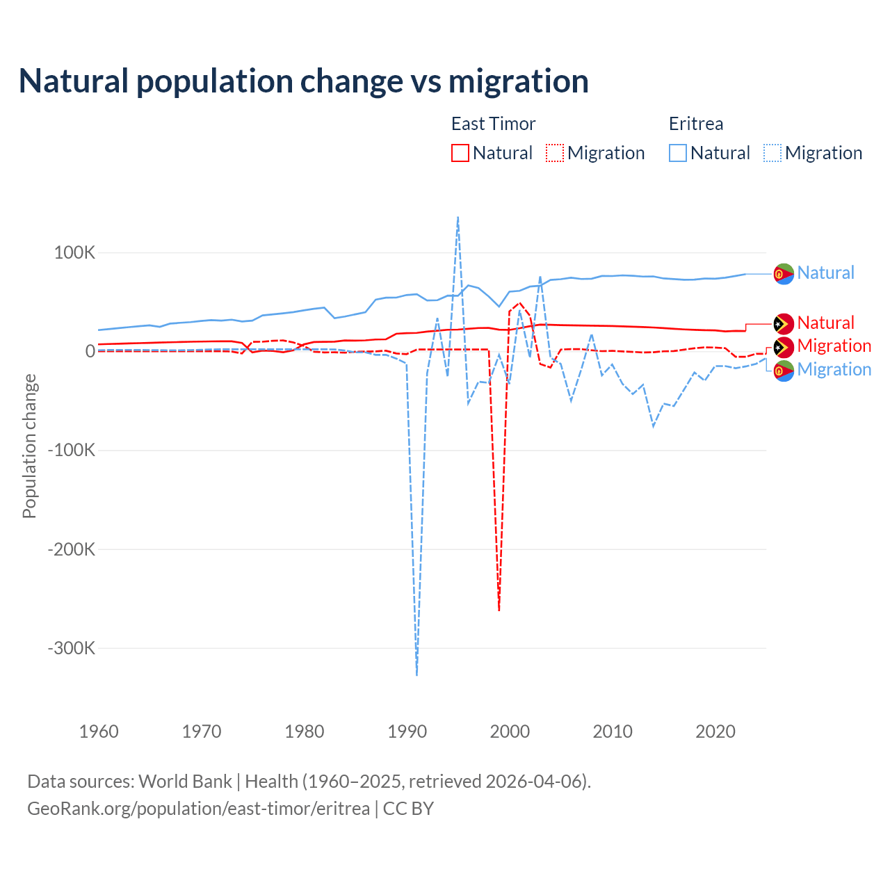Over the last 10 years, 98.3% of the population change in East Timor is from natural causes (a gain of 217,698 people) and 1.66% is from migration (a gain of 3,665 people). In Eritrea 68.8% is from natural causes (a gain of 742,837 people) and 31.2% is from migration (a loss of 336,243 people).