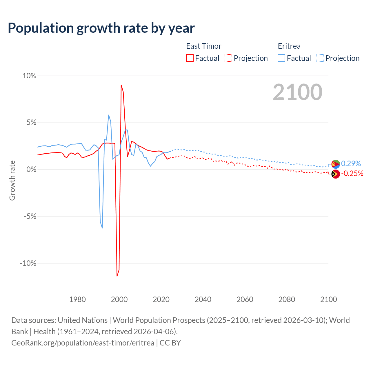 - For the last 10 years, East Timor has had an average growth rate of +1.74% per year vs +1.28% in Eritrea.