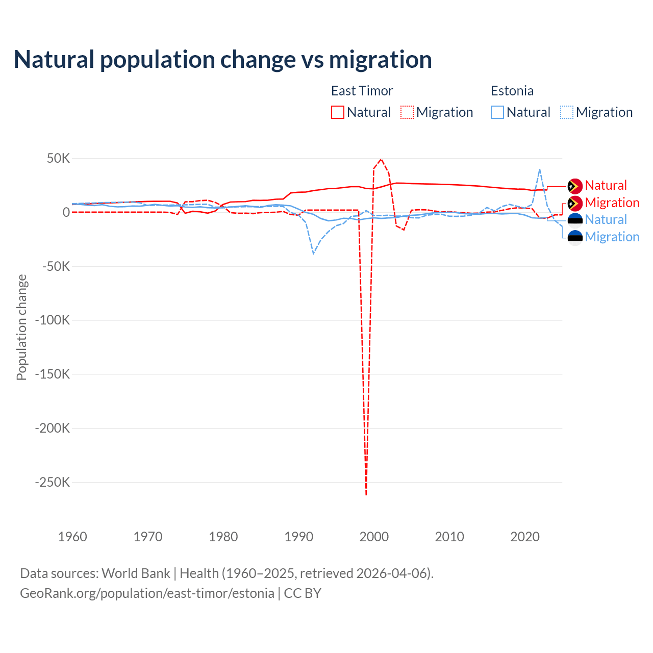 Over the last 10 years, 98.3% of the population change in East Timor is from natural causes (a gain of 217,698 people) and 1.66% is from migration (a gain of 3,665 people). In Estonia 26.1% is from natural causes (a loss of 27,683 people) and 73.9% is from migration (a gain of 78,553 people).