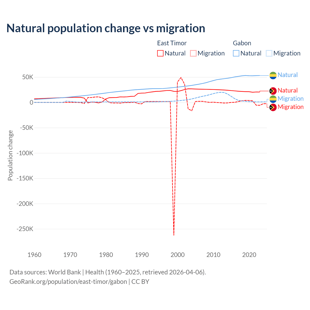 Over the last 10 years, 98.3% of the population change in East Timor is from natural causes (a gain of 217,698 people) and 1.66% is from migration (a gain of 3,665 people). In Gabon 91.1% is from natural causes (a gain of 515,484 people) and 8.86% is from migration (a gain of 50,119 people).